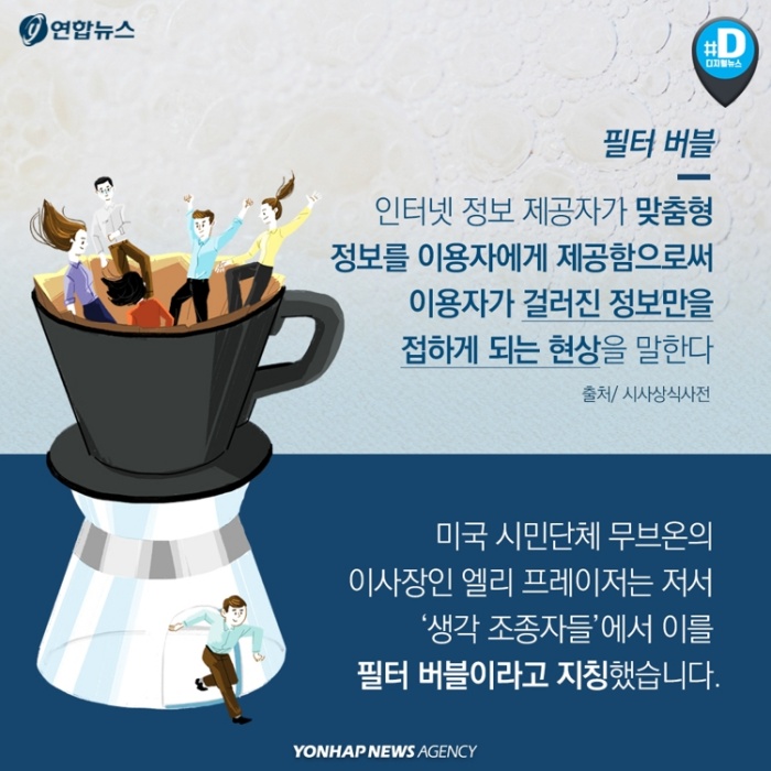 필터 버블 - 필터링된 버블 안에 갇혀 버린다, 그 필터링에 대한 의문이 허용되지 않음, 내가 선택할 수도 없음