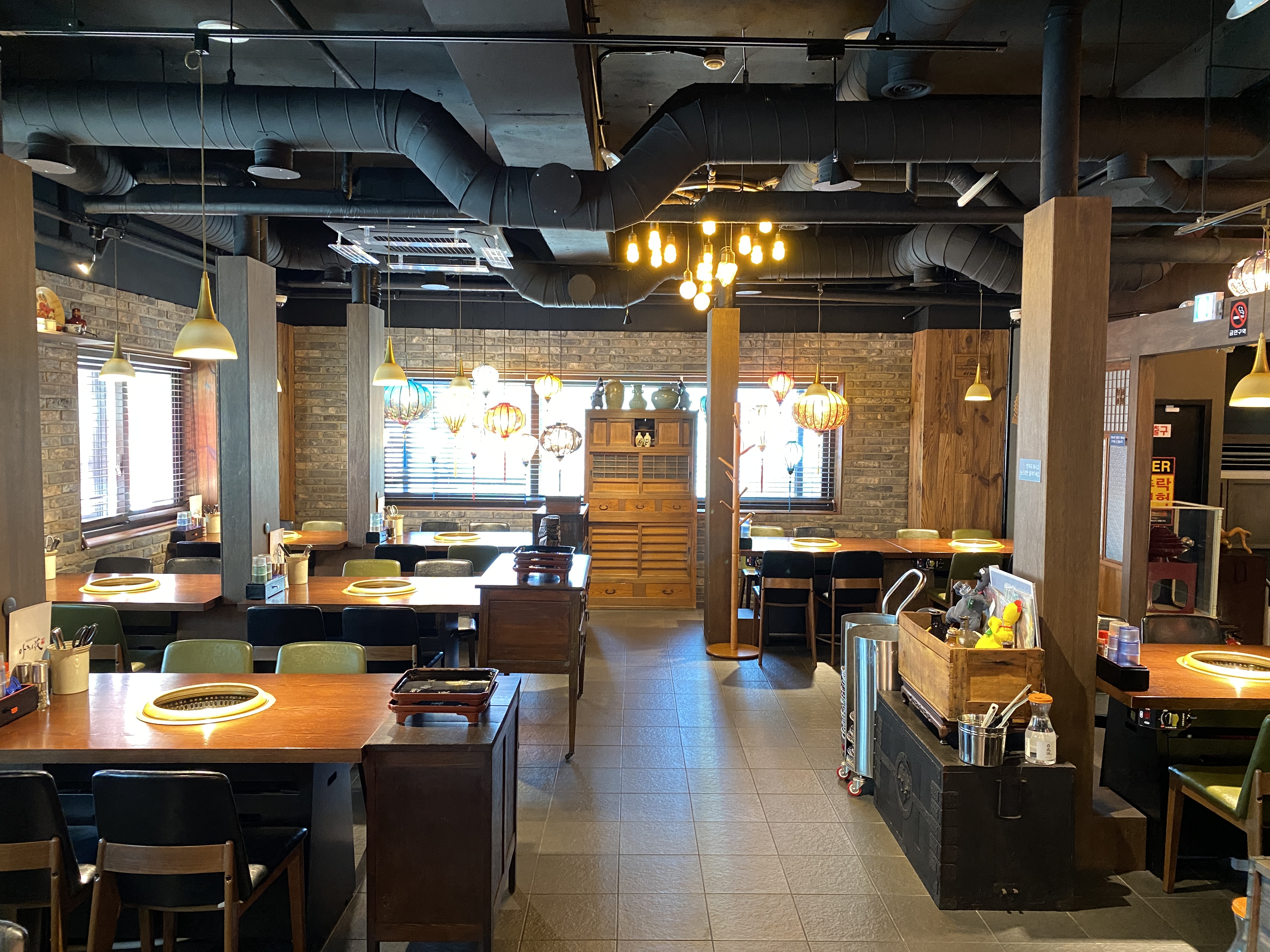 테이블에 붙은 배기 장치로 연기가 테이블 아래로 나갑니다. 요즘엔 이런 고기집들 좀 있던데, 아무래도 비용이 더 많이 드는지 많지는 않더라고요. 아쉽습니다. 사용해보면 천정에서 내려오는 배기통 없어서 엄청 편합니다. 맞은편 앉은 사람들 가리지도 않고요.