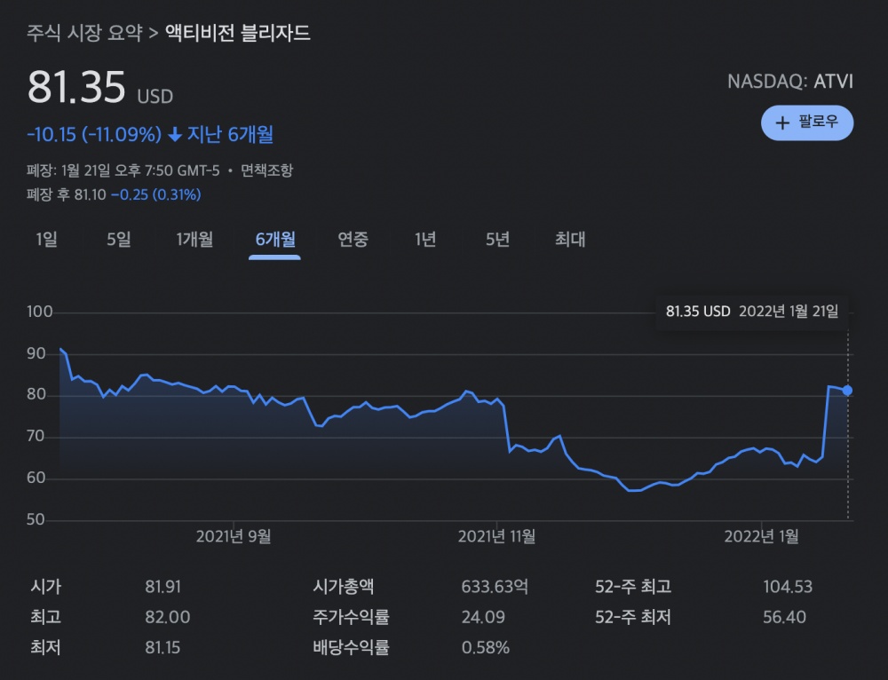 마이크로소프트 주가는 큰 변화가 없는 반면, 액티비전 블리자드는 성추행 홍역 후 떨어졌던 주가가 급등 했습니다.