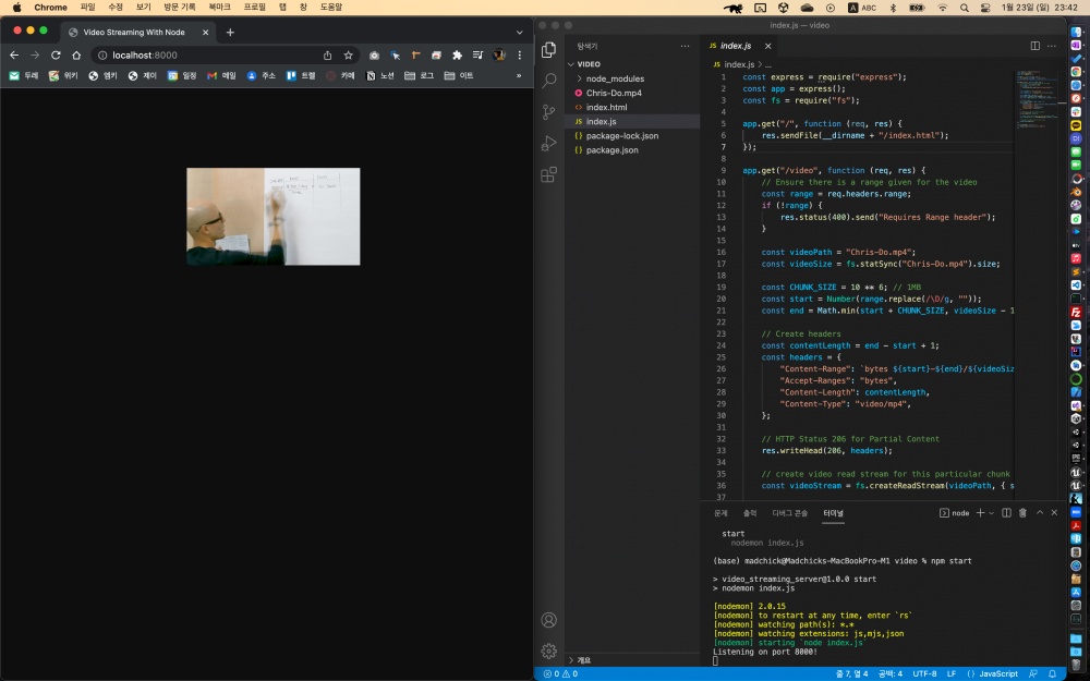 서버에서 헤더 정보에 Content-Range 를 넘겨주면 웹 브라우저의 video 태그를 다운로드를 다 받은 후에 동작하는 것이 아니라, 넘겨 받는 대로 바로 재생시켜 주는 스트리밍 모드로 동작을 시키는군요.