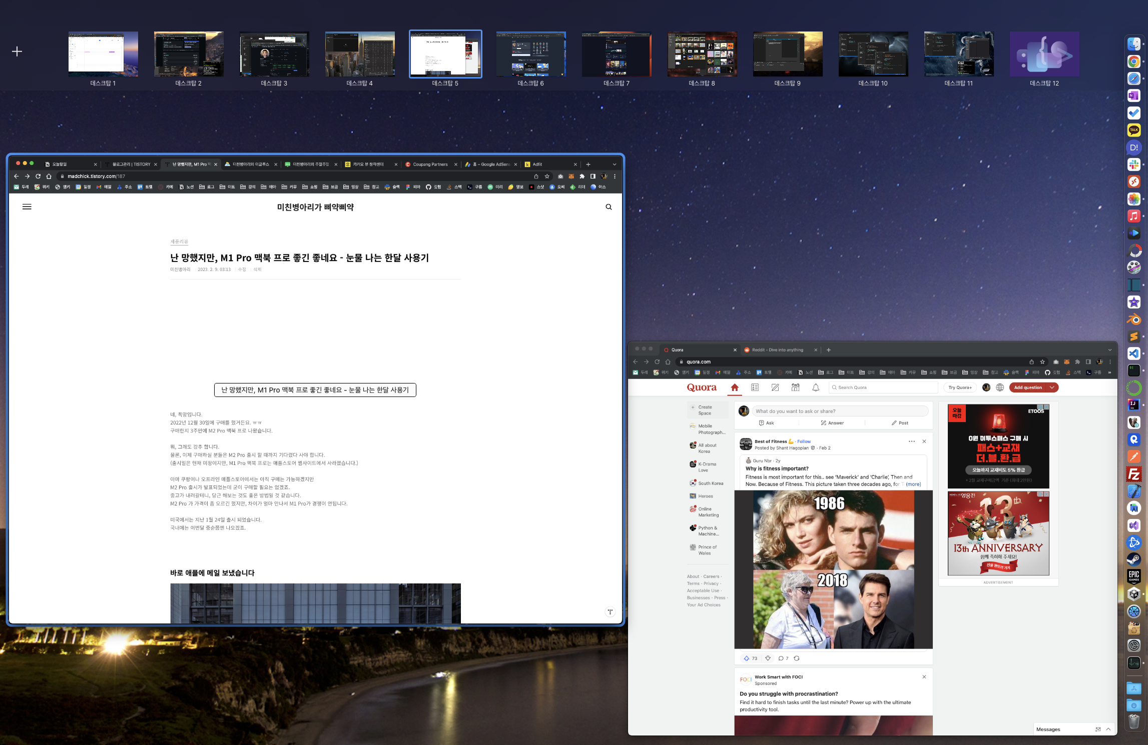 - 각 데스크탑 마다 필요한 앱들을 띄워 놓습니다. 업무용, 웹개발용, 앱개발용, 인강용, 영화/드라마 감상용, 블로깅용 등등