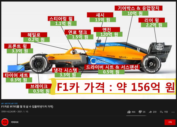 경기를 보면 프론트 윙은 툭하면 박살 나던데, 프론트 윙 하나가 3억원이나 하네요