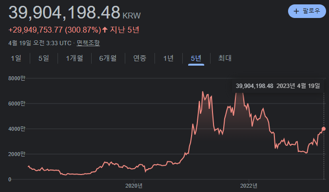워낙에 춤을 추니 시세라는게 의미가 없긴 한데, 현재 1 비트코인 가격은 39,904,198원