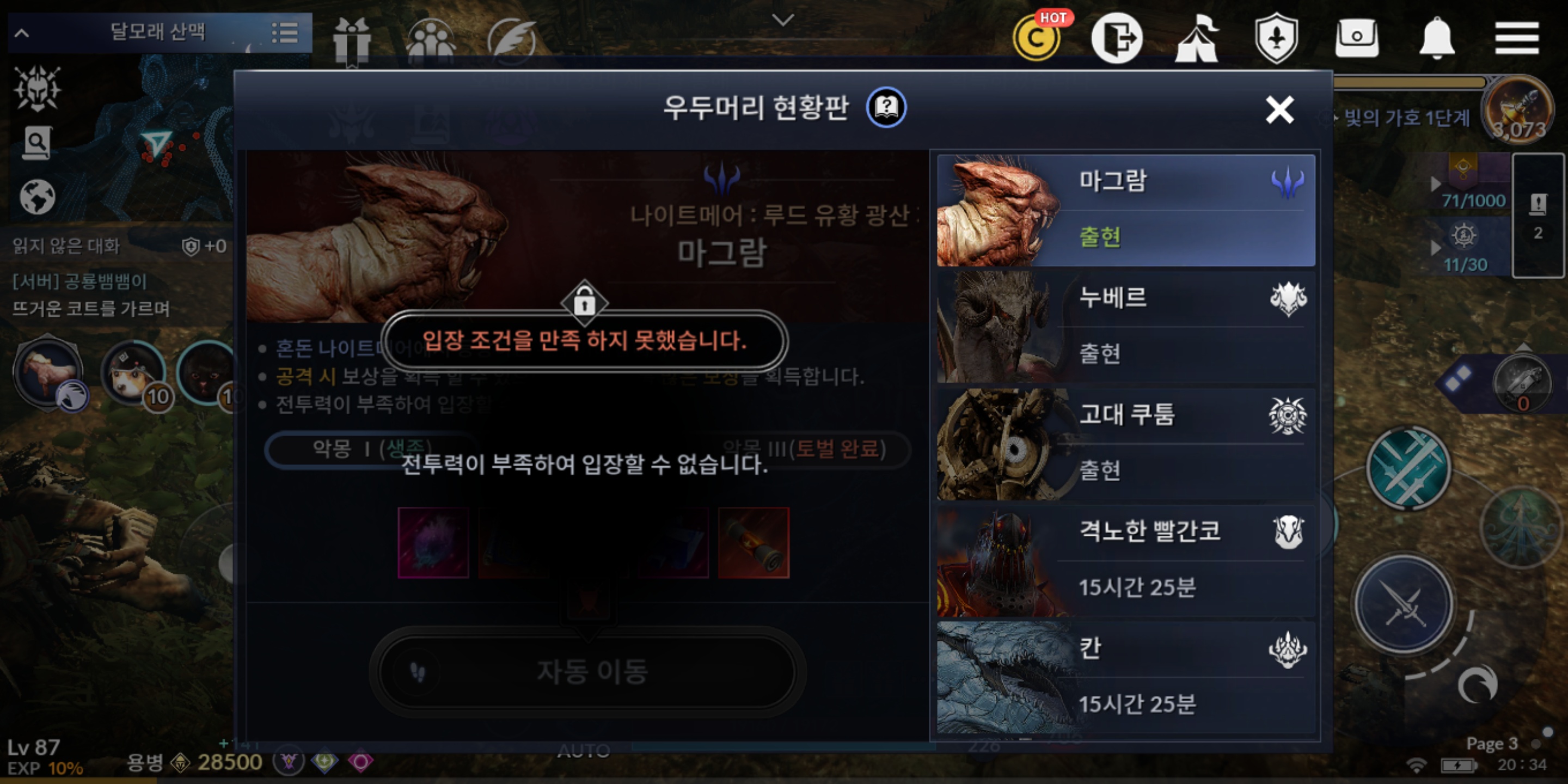 현재 상황은 전투력이 낮아서 사냥을 할 수 없는 지역이 많습니다. 37,000 정도의 전투력이 되어야 최종 지역에 갈 수가 있는데 전투력 랭킹으로 보면 상위 1%도 아니고, 상위 3,000명 안에 들어야 갈 수 있다는 이야기 입니다. 이거 게임이 너무 빡신거 아냐??