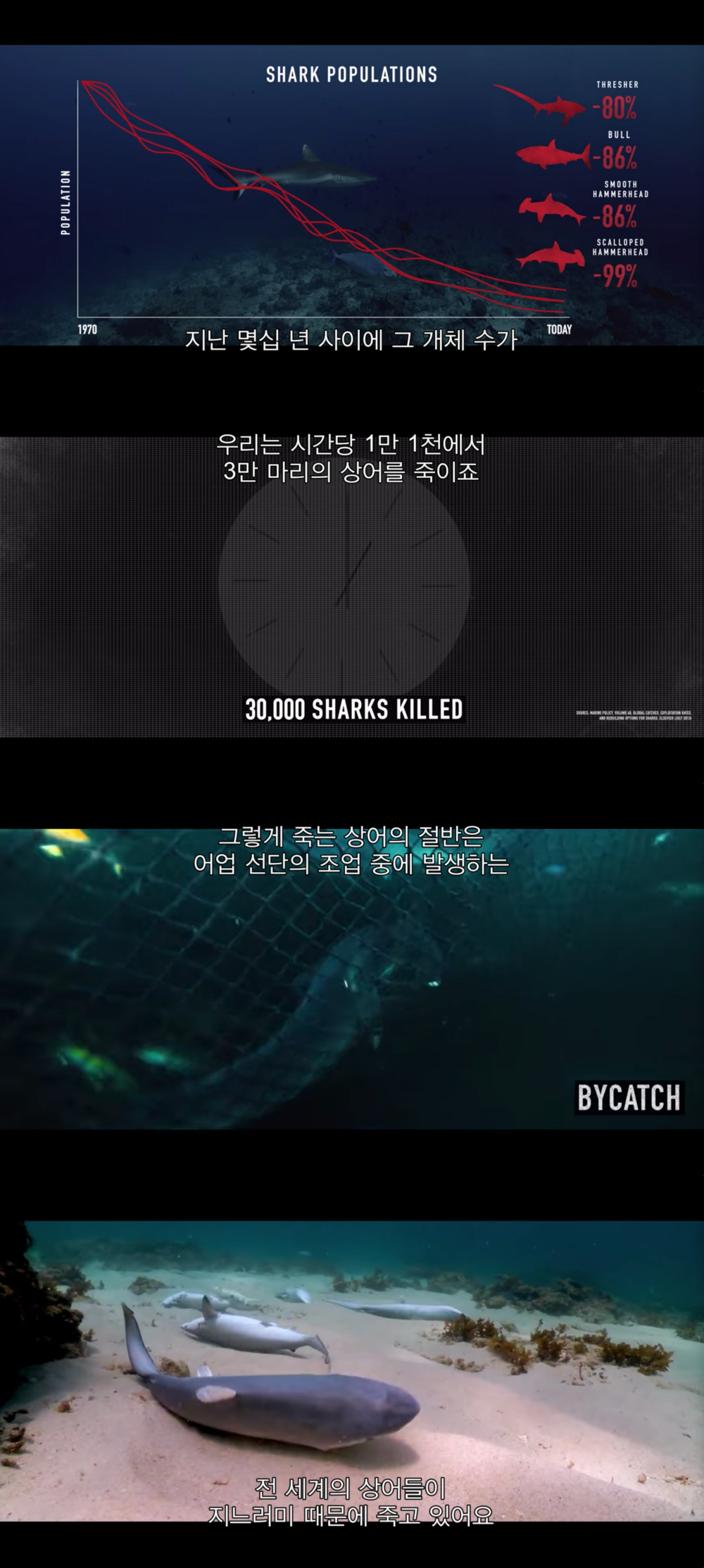 한시간당 3만마리 정도의 상어가 죽는데, 대부분 조업활동 중 부수적으로 잡히며 대부분 죽은 채 바다에 다시 버려집니다