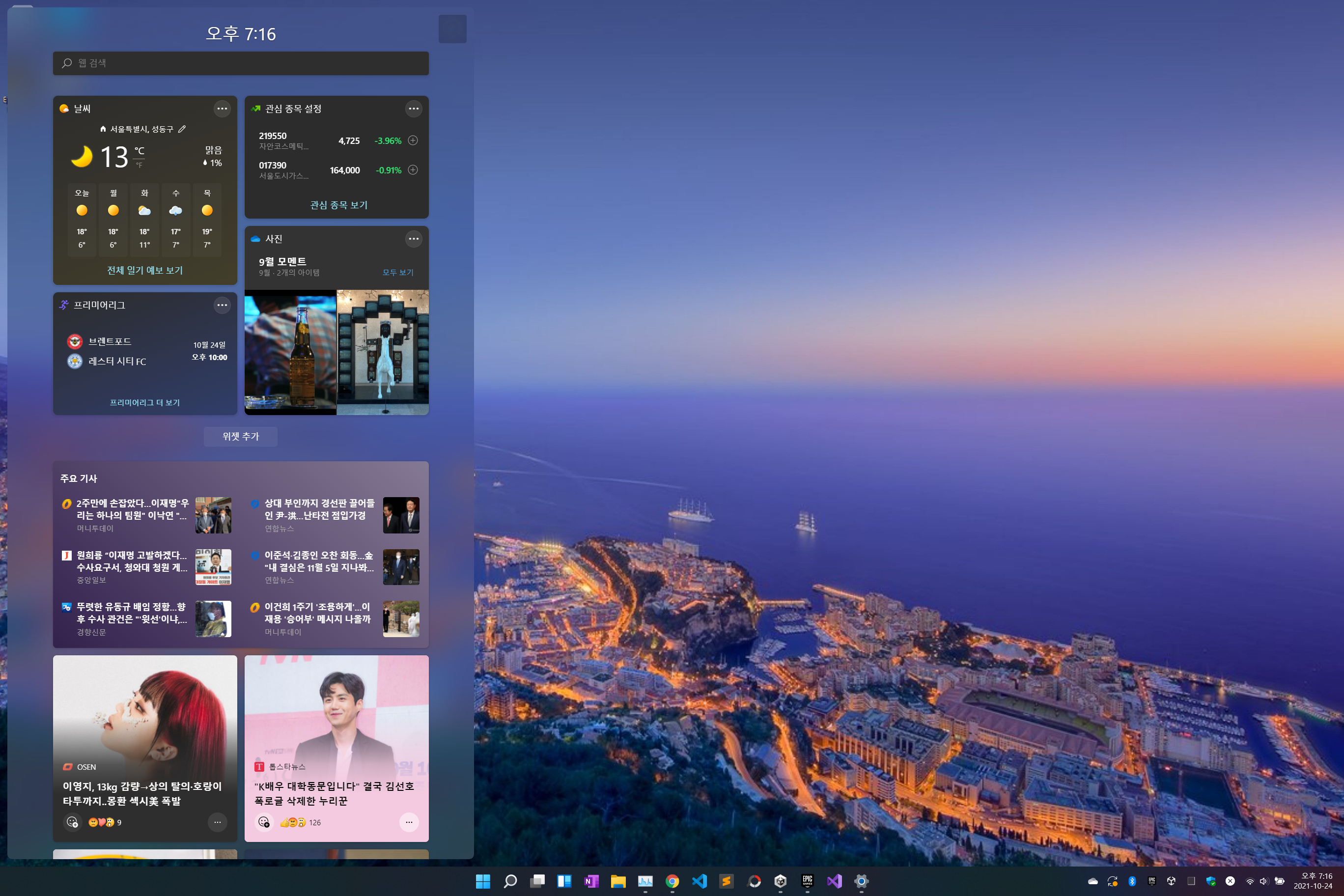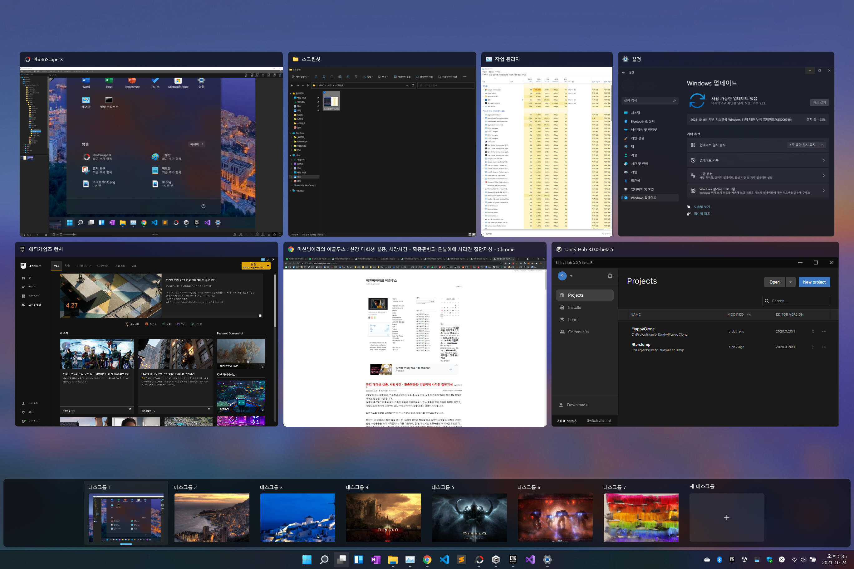 윈도우 업데이트를 했습니다. 윈11, 확실히 많이 이뻐지긴 했지만 뭐가 좋아졌는지는 잘 모르겠습니다. 하지만, 아주 맘에 드는 점 하나는 있네요. 데스크탑마다 다른 이미지 설정 가능해