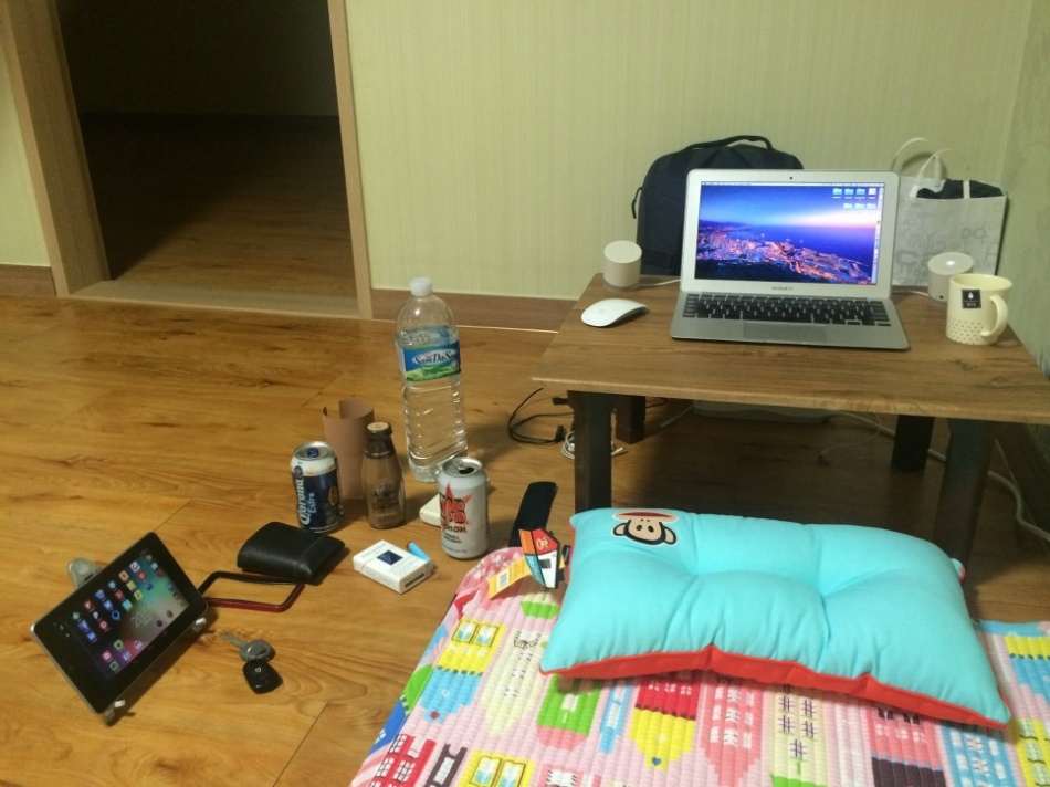 텅텅 비고 썰렁한 숙소에 온기를 채우기 전, 미니멀리즘 숙소 모습입니다. 책상 없으면 밥상이긴 한데, 아 이거 허리 엄청 아파요.